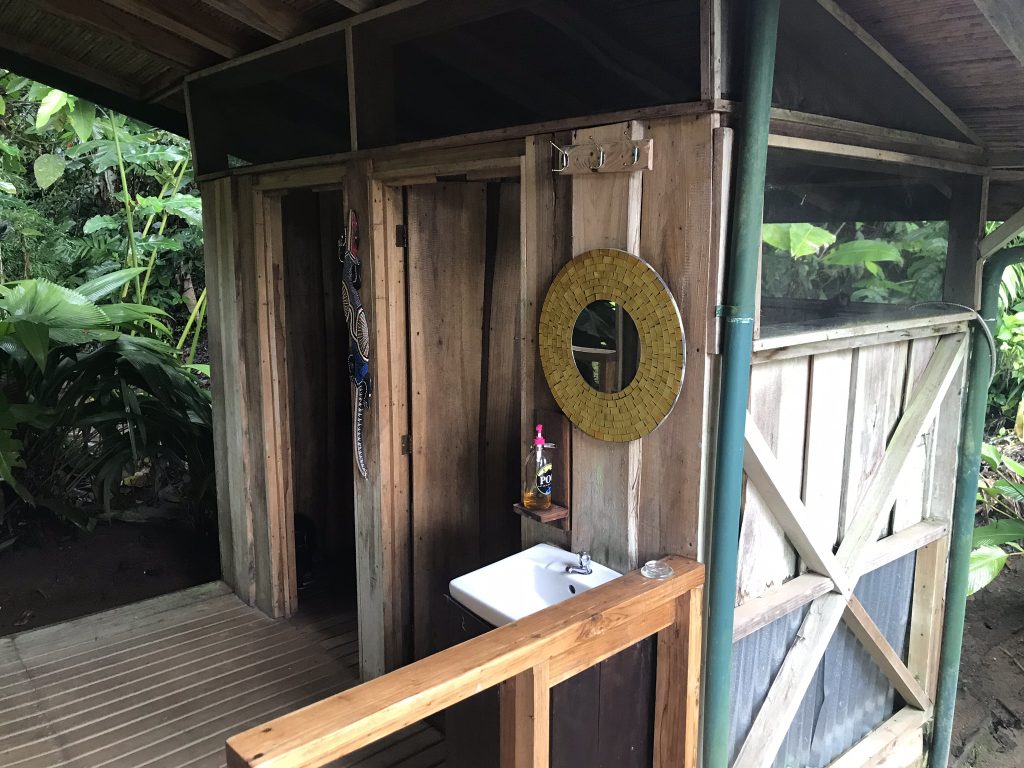 The room had a wooden boardwalk surrounding the front and sides and the bathroom was around the corner, but still exclusive to our room. The bathroom and shower were separate and small, and cute. Because I am tall, I could peek out over the shower and see the jungle but I felt so secluded and unobserved and luxurious.